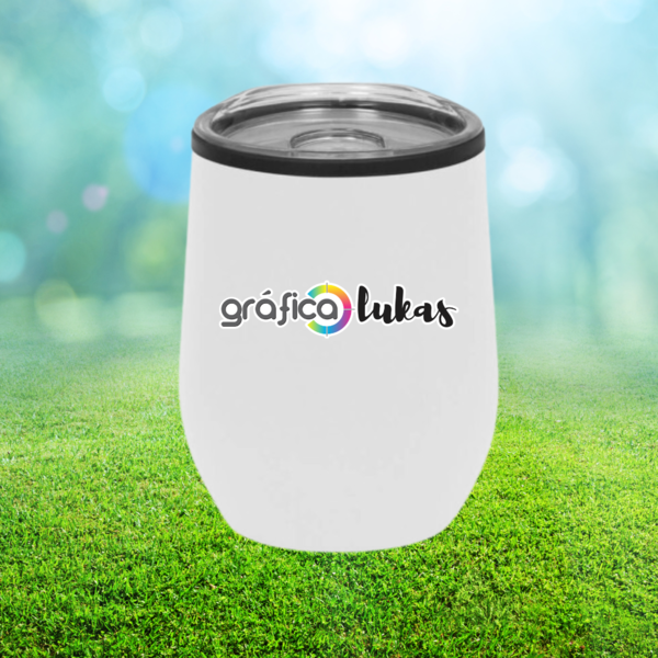 Mug metálico con tapón de rosca anti derrame de plástico transparente. Interior plástico y exterior de acero inoxidable SS 201. Base antideslizante. Medidas: 12.1 × 8 cm. Capacidad 350 ml. Incluye impresión a color en DTF UV. Colores disponibles blanco y negro.